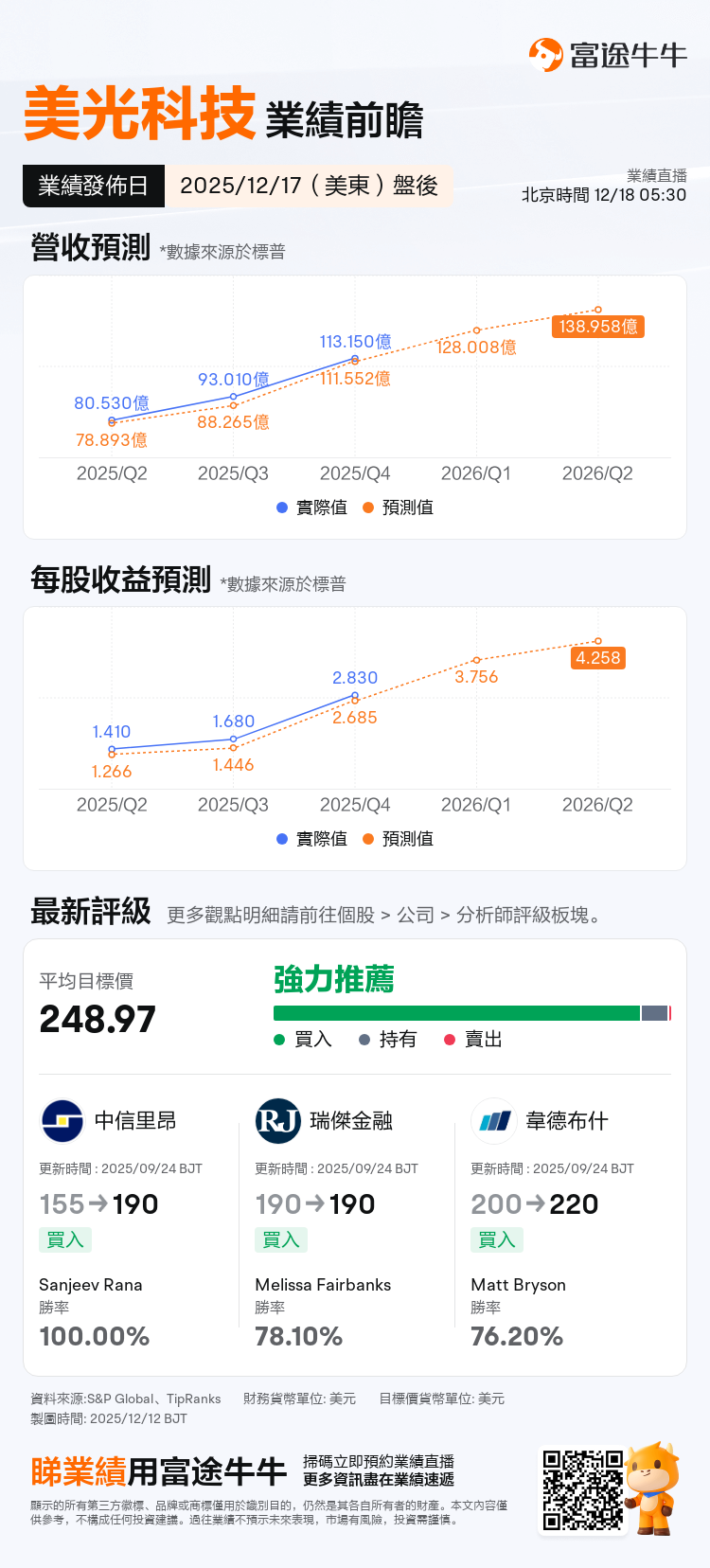 上一季度,美光凭借产品结构优化与价格环境改善,实现了盈利的超预期增长。本次季度,在DRAM价格上行、NAND业务修复、高价值的HBM产品占比提升等多重因素作用下,毛利率与净利率有望继续环比抬升。富国银行已上调美光盈利预期,将本季度营收及每股收益预期上调至128亿美元/3.87美元,处于公司指引区间上限;并将2026财年、2027财年营收及每股收益预期分别上调至547亿美元/17.85美元和652亿美元/22.41美元,首次给出2028财年712亿美元营收、22.80美元每股收益的预期,目标价更是上调至300美元。