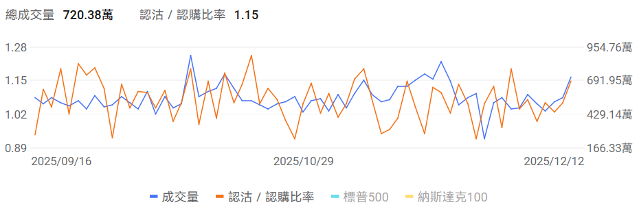 当前美股指数期权市场成交量上行,认沽/认购比例上行。