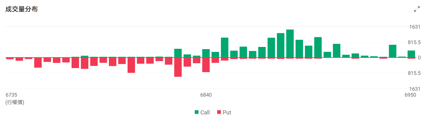 今日到期的 $标普500指数 (.SPX.US)$ 期权成交量分布:Call单与Put单分布存在分歧,Put单峰值在6825点,Call单峰值在6885点。