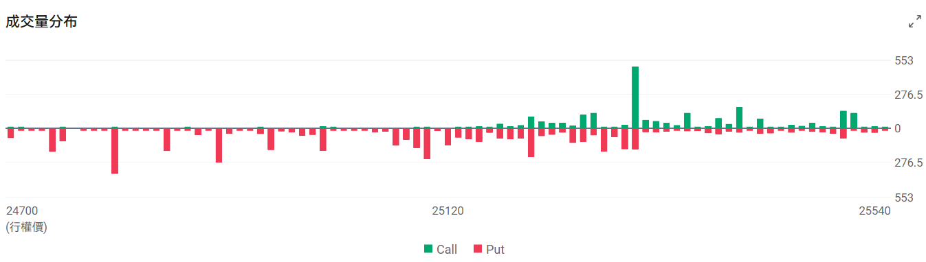 今日到期的 $纳斯达克100指数 (.NDX.US)$ 期权成交量分布:Call单峰值为25300,Put单峰值在24800点。