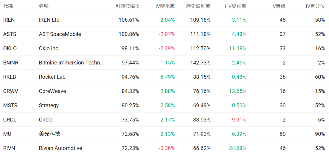 美股期权波动率排行榜前十(标的市值>100亿美元,且期权成交量>10万张)