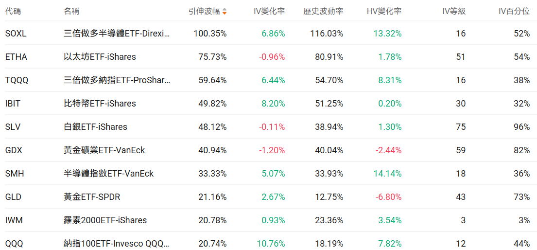 美股ETF引申波幅排行榜前十(标的要求:市值>100亿美元)