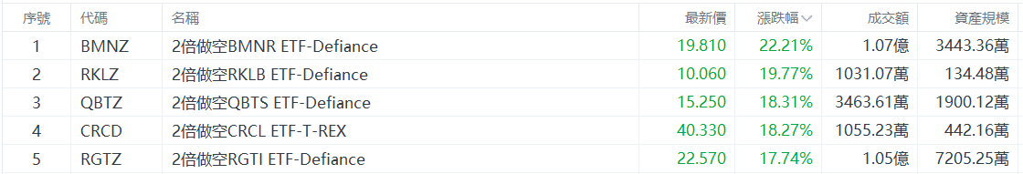 $2倍做空RGTI ETF-Defiance(RGTZ.US)$ 升17.74%,成交额1.05亿美元。