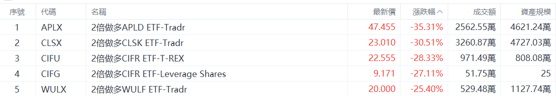 $2倍做多APLD ETF-Tradr(APLX.US)$ 跌35.31%,成交额2562.55万美元。