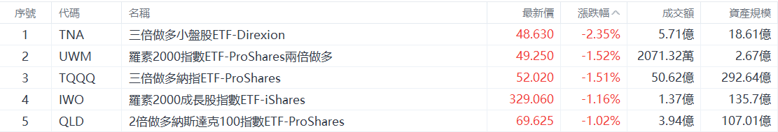 $三倍做多小盘股ETF-Direxion(TNA.US)$ 跌2.35%,成交额5.71亿美元。