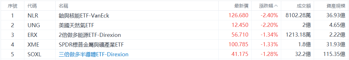 $美国天然气ETF(UNG.US)$ 跌2.20%,成交额2亿美元。