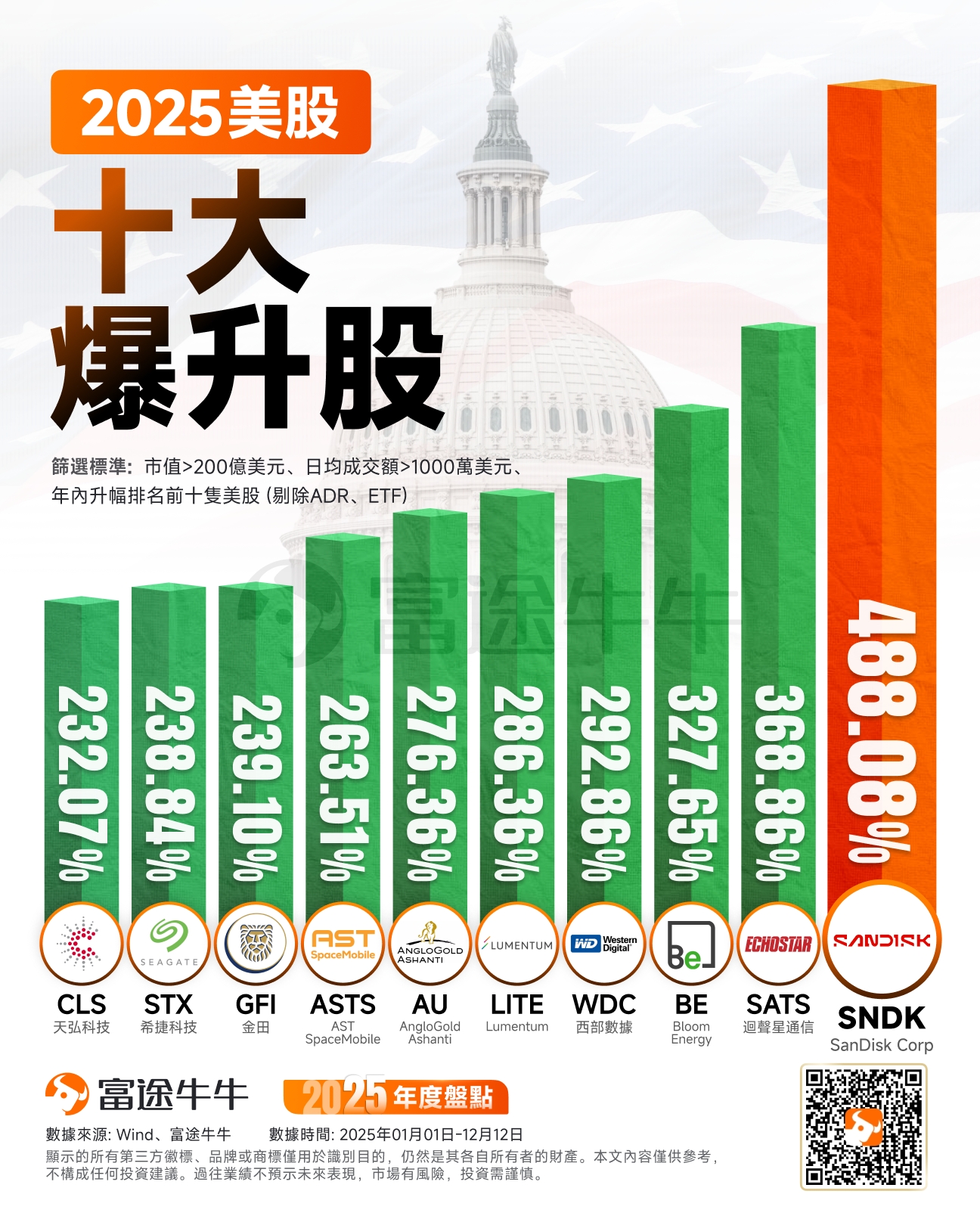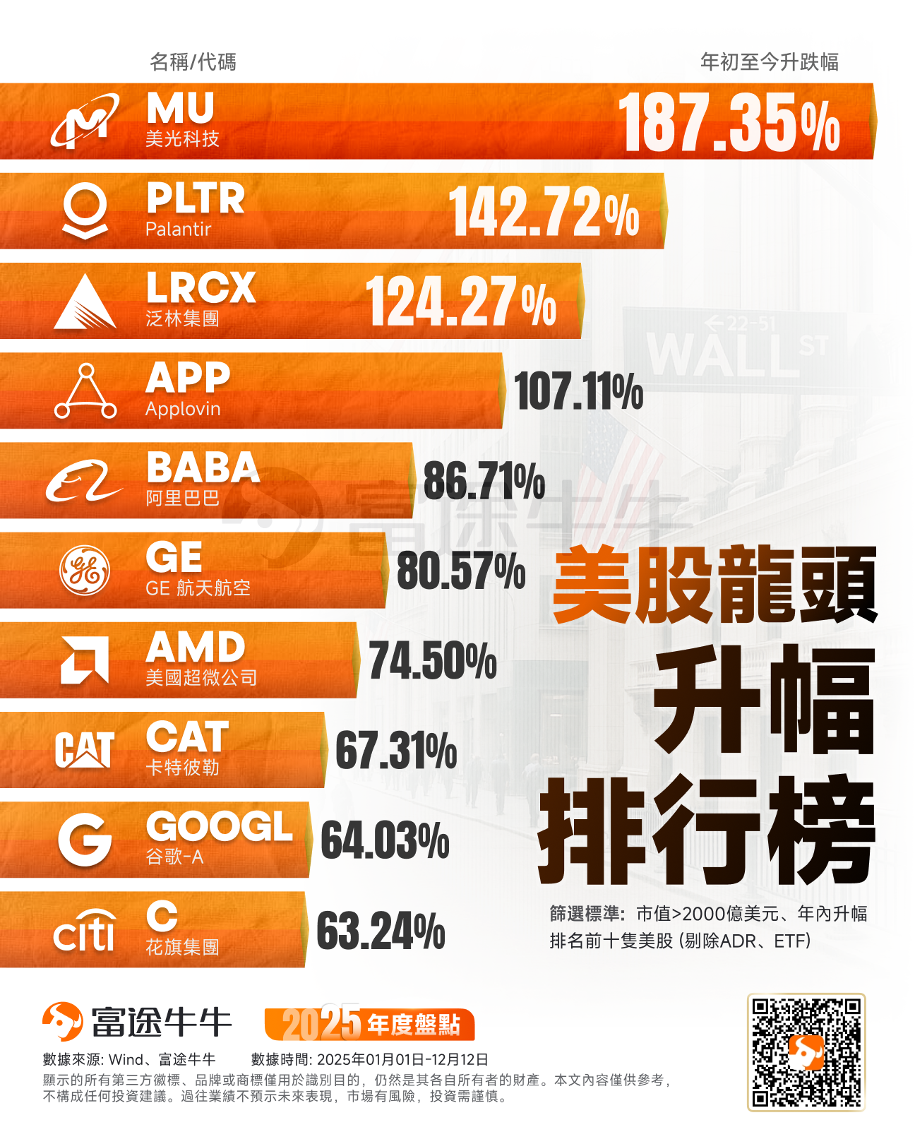 站在2025年的尾声,回望这跌宕起伏的一年,究竟哪些资产穿越了周期?又是哪些个股在AI的新旧交替中脱颖而出?让我们一同盘点美股的年度十大牛股与巨头的表现。