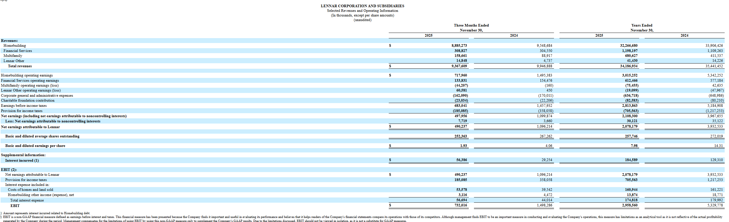 截至 2025 年 11 月 30 日的财年,莱纳归属于公司的净收益为 21 亿美元,合稀释后每股 7.98 美元,而截至 2024 年 11 月 30 日的财年为 39 亿美元,合稀释后每股 14.31 美元。剔除 1.30 亿美元技术投资按市值计价收益以及米尔罗斯交换要约产生的 1.56 亿美元一次性损失后,截至 2025 年 11 月 30 日的财年莱纳归属于公司的净收益为 21 亿美元,合稀释后每股 8.06 美元;相比之下,截至 2024 年 11 月 30 日的财年剔除 2,500 万美元技术投资按市值计价收益及其他一次性项目后,莱纳归属于公司的净收益为 38 亿美元,合稀释后每股 13.86 美元。