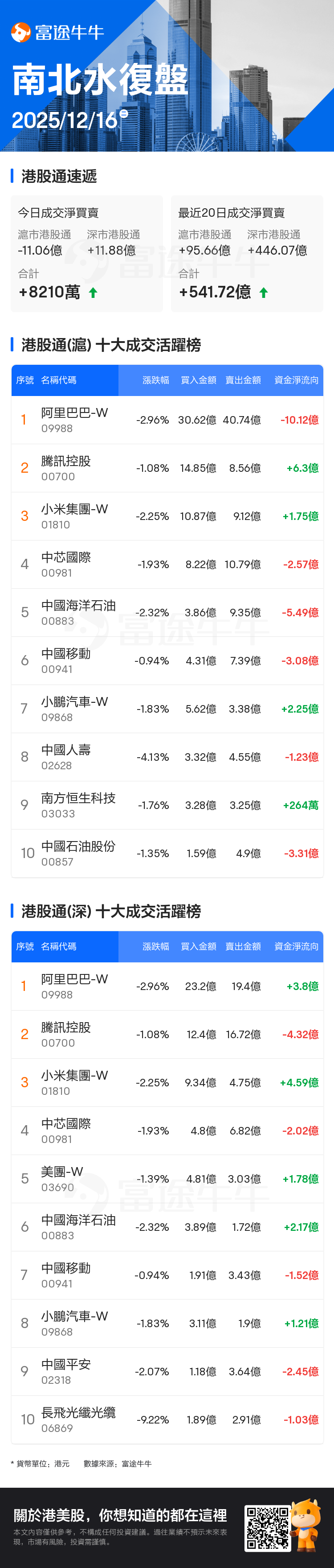 12月16日(周二),南下资金今日净买入港股8,210万港元。