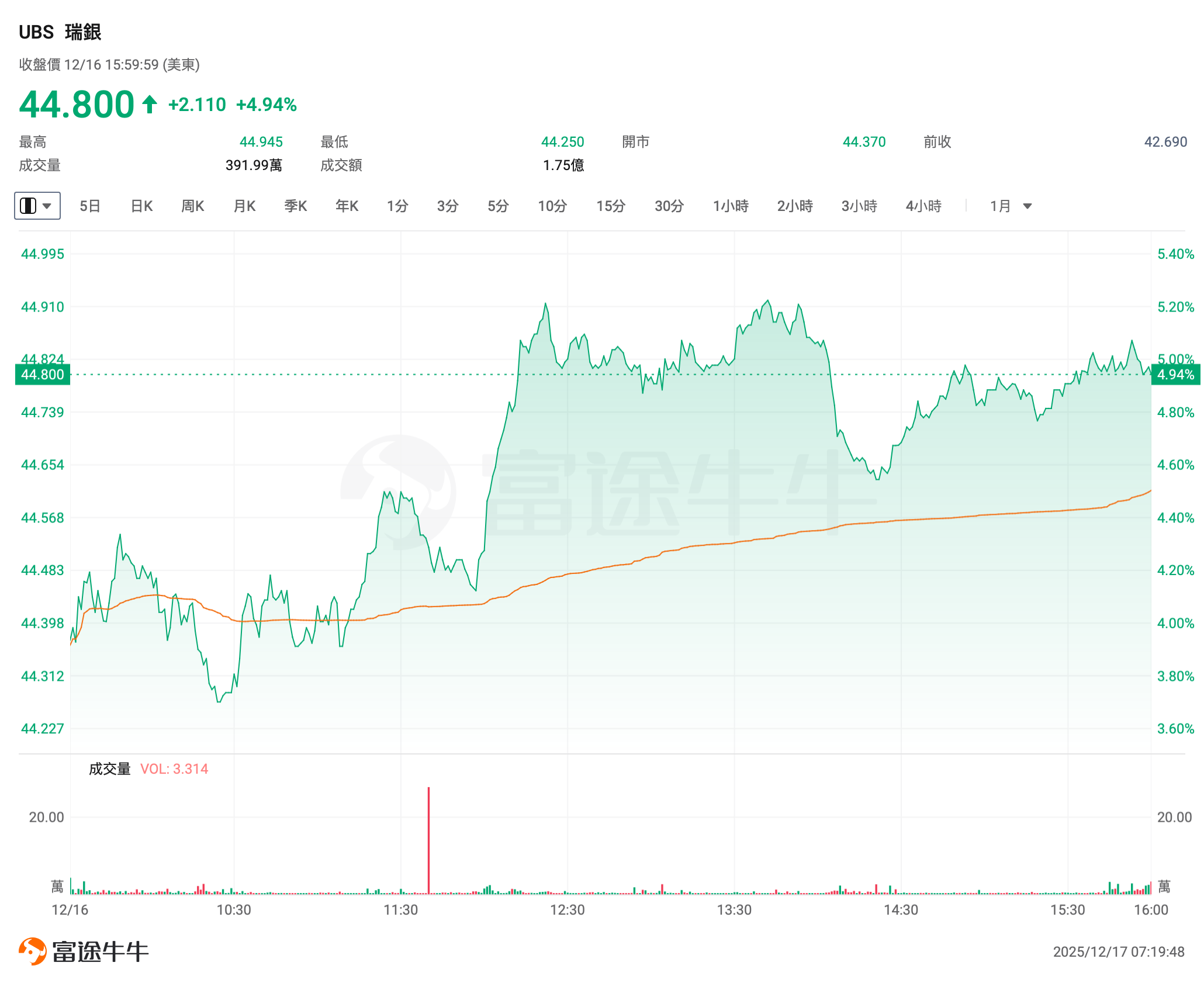 瑞银涨近5%刷新高,瑞士立法者试图确保其在国际上保持竞争力