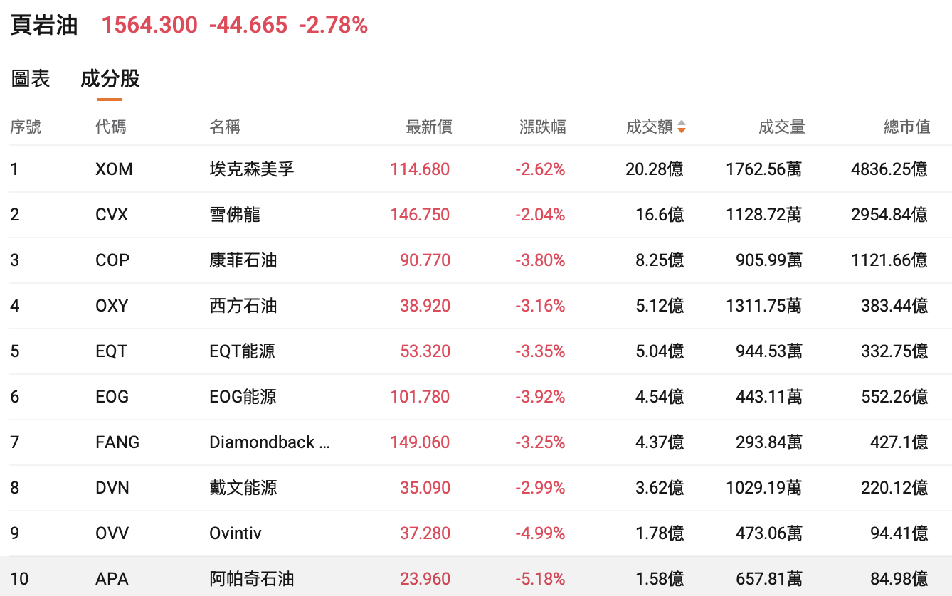 页岩油概念走低, $埃克森美孚(XOM.US)$ 、 $雪佛龙(CVX.US)$ 跌超2%, $康菲石油(COP.US)$ 、 $EQT能源(EQT.US)$ 、 $西方石油(OXY.US)$ 跌超3%。