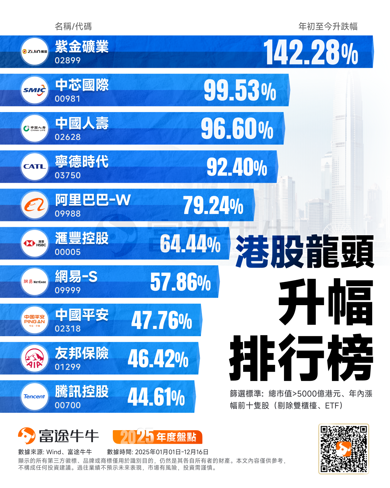 黄金股龙头 $紫金矿业 (02899.HK)$ 以142%的涨幅位居榜首,其全球化资源布局及业绩持续突破,叠加铜、金等大宗商品价格不断走强,公司市值一度逼近万亿港元。紧随其后的是半导体企业 $中芯国际 (00981.HK)$ ,公司受益于国产替代浪潮,股价年内接近翻倍。
