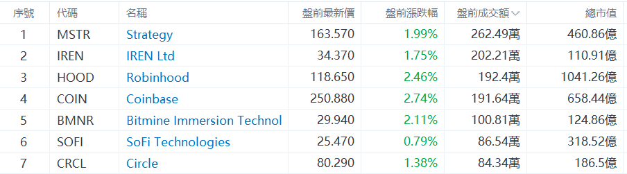 $加密货币概念股(LIST20010.US)$ 盘前走高, $Robinhood(HOOD.US)$ 、 $Coinbase(COIN.US)$ 、 $Bitmine Immersion Technologies(BMNR.US)$ 涨超2%, $Strategy(MSTR.US)$ 、 $IREN Ltd(IREN.US)$ 涨超1%。