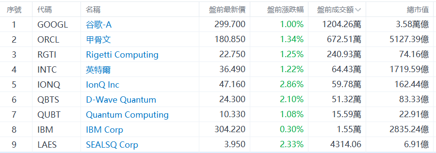 $量子计算概念(LIST2594.US)$ 盘前上涨, $D-Wave Quantum(QBTS.US)$、 $IonQ Inc(IONQ.US)$涨超2%, $Rigetti Computing(RGTI.US)$ 、 $Quantum Computing(QUBT.US)$ 涨超1%。