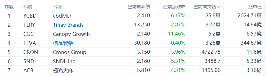 $大麻股(LIST2997.US)$盘前延续强势, $Canopy Growth(CGC.US)$涨超11%, $cbdMD(YCBD.US)$ 涨超6%, $Tilray Brands(TLRY.US)$ 涨超2%。