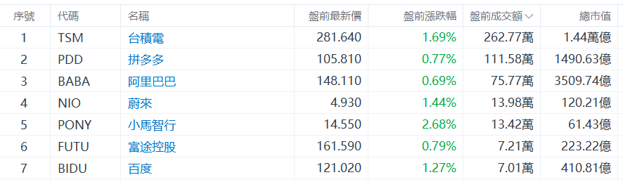 $热门中概股(LIST2517.US)$ 盘前普涨, $小马智行(PONY.US)$涨超2%, $百度(BIDU.US)$、 $蔚来(NIO.US)$ 涨超1%。