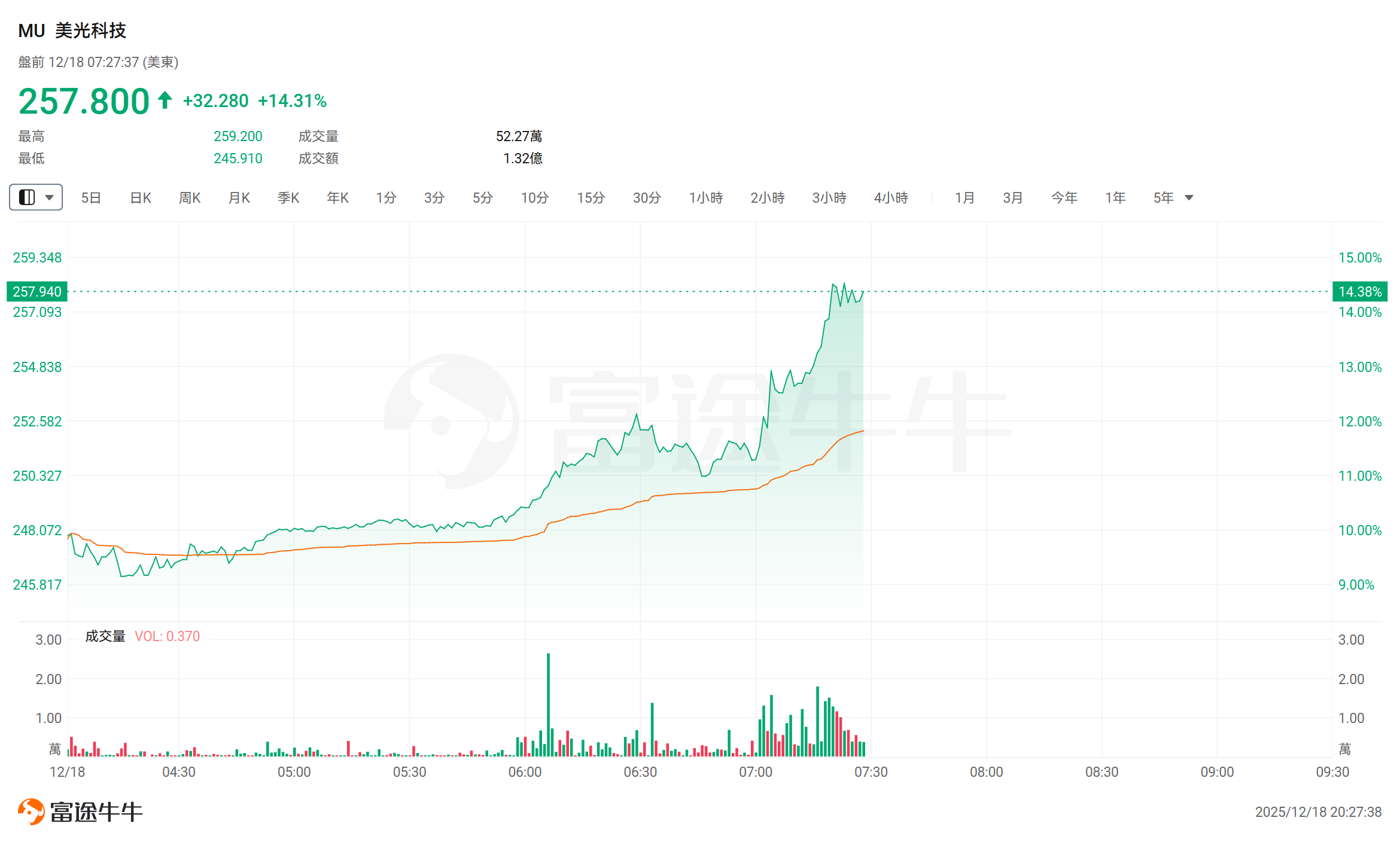 周四盘前,美国11月CPI发布前夕, $美光科技(MU.US)$ 财报提振科技股乐观情绪,三大期指持续走高,道指期货涨0.24%,纳指期货涨0.79%,标普500期货涨0.46%。