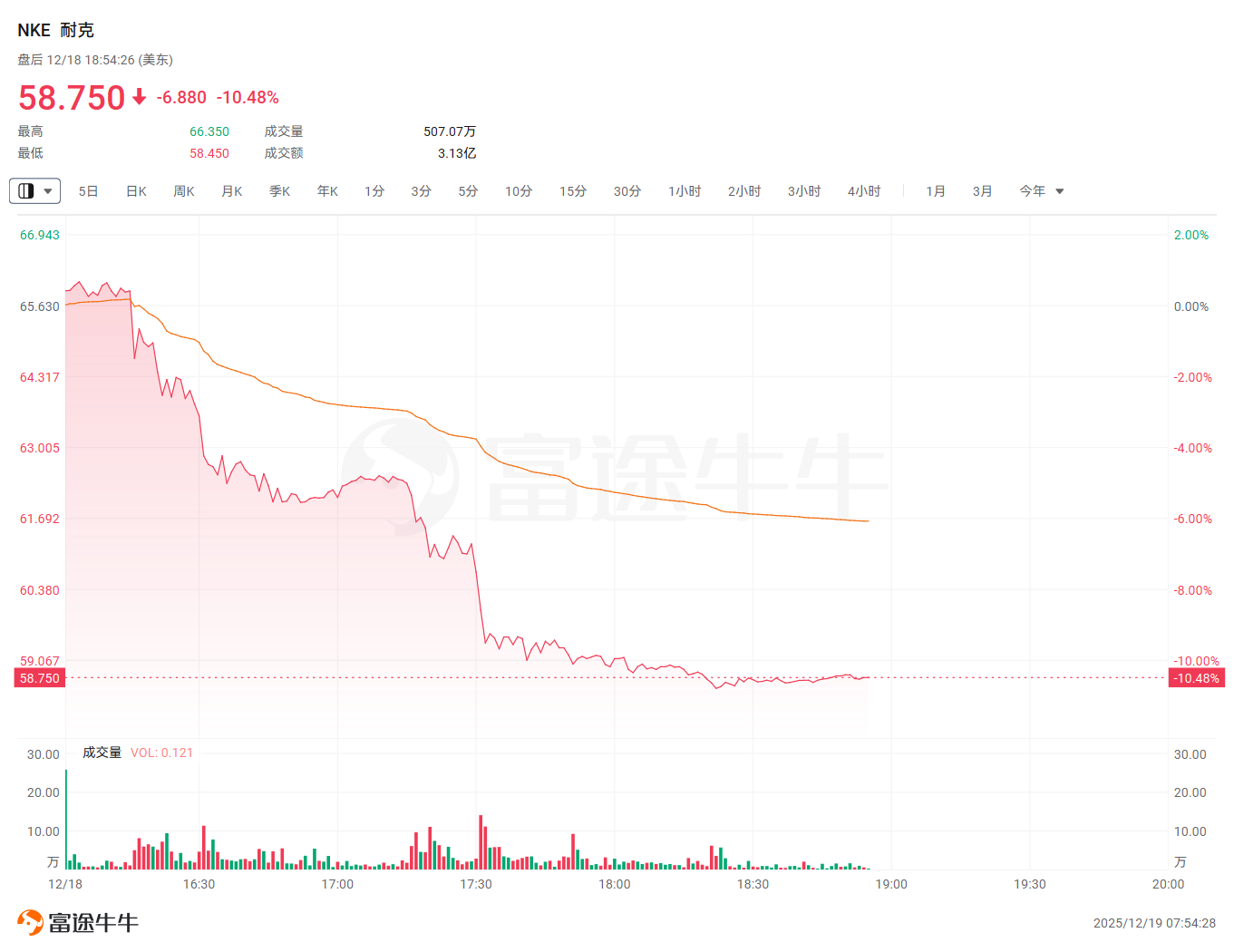 耐克股价周四报收于65.63美元,2025年开年以来累计跌幅已达13.1%,而同期标普500指数却录得15.4%的显著涨幅。在最新季度业绩披露后,该股盘后交易时段迅速下挫超10%,股价跌至58.75美元。
