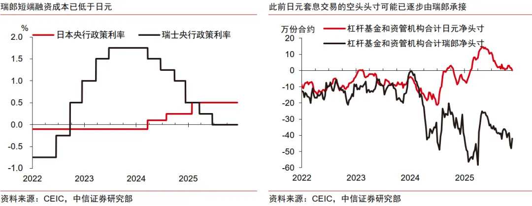 一方面,与去年不同,目前瑞郎的短端融资成本已低于日元、且瑞士央行可能干预汇市促进瑞郎贬值,故日元已不再是全球套息交易首选的融资货币,存量套息交易的日元头寸可能已逐步被瑞郎所承接。