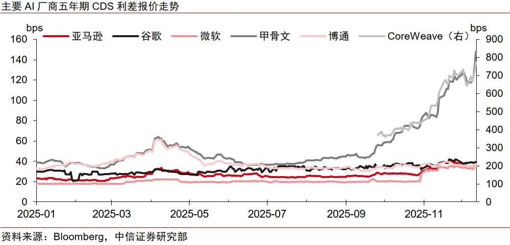 对于美股,市场不时担忧AI叙事的脆弱性,近日$甲骨文 (ORCL.US)$和$CoreWeave (CRWV.US)$的五年期CDS利差显著上升,不过其余多数AI产业链龙头的CDS则仍较稳定,这表明市场对AI泡沫化的质疑可能集中体现于业务模式较激进的少数企业,而财务较稳健的企业仍能获得市场信任。