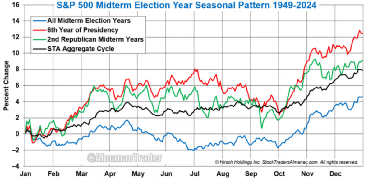 赫希控股公司(Hirsch Holdings)首席执行官兼《股票交易员年鉴》(Stock Trader’s Almanac)主编杰弗里·赫希(Jeffrey Hirsch)指出,总统第二任期的中期选举年往往对股市更为有利。