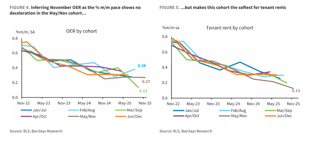 巴克莱的数据显示,报告中的租金仅上涨0.13%,OER上涨0.27%(双月度涨幅)。这意味着10月和11月的平均月度租金涨幅仅为6个基点。分析师对此表示高度怀疑,认为即使考虑到市场租金降温的趋势,这一数值也显著低于合理水平,进一步印证了统计方法存在下行偏差的观点。
