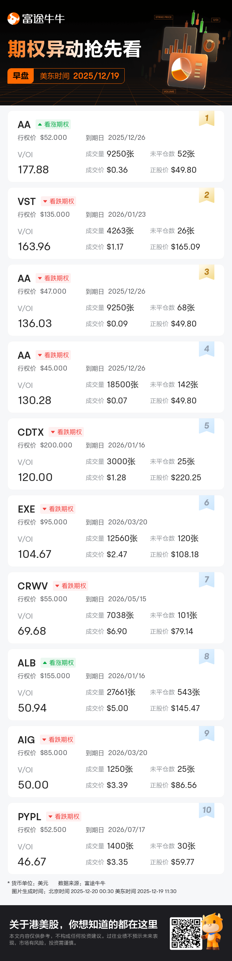 $美国铝业公司 (AA.US)$的一笔看跌期权成交量达到了9,250张,远超过其未平仓数68张,V/OI值高达136.03,该交易涉资8.33万美元。该合约的行权价为47.000美元,到期日为7天后的2025年12月26日。