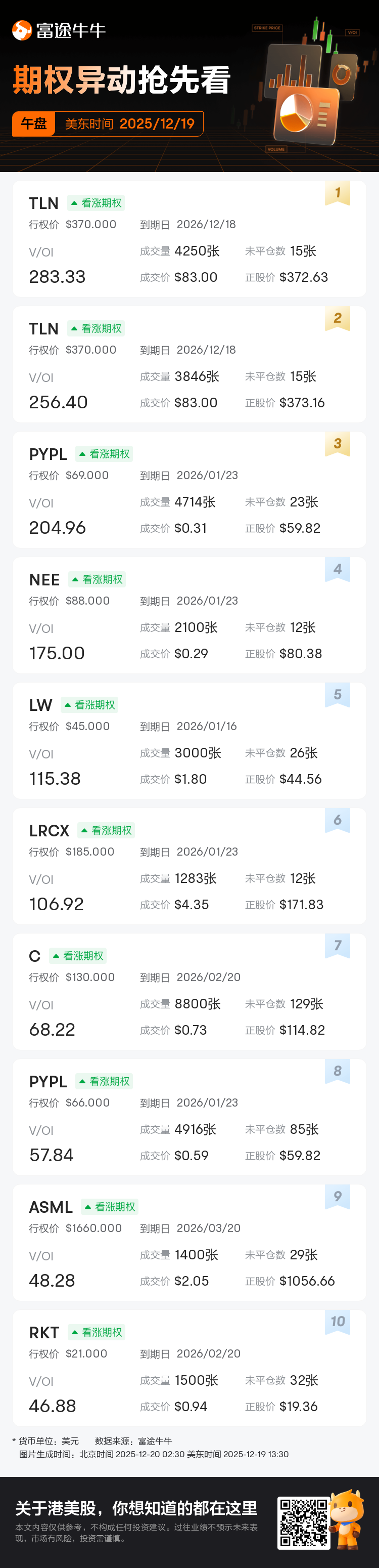 若在对应时段有超过3笔V/OI≥10的交易,将在美东时间11:30、13:30和16:30各生成一篇期权异动资讯。