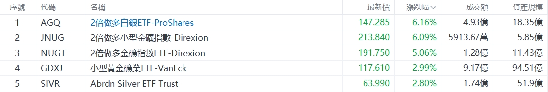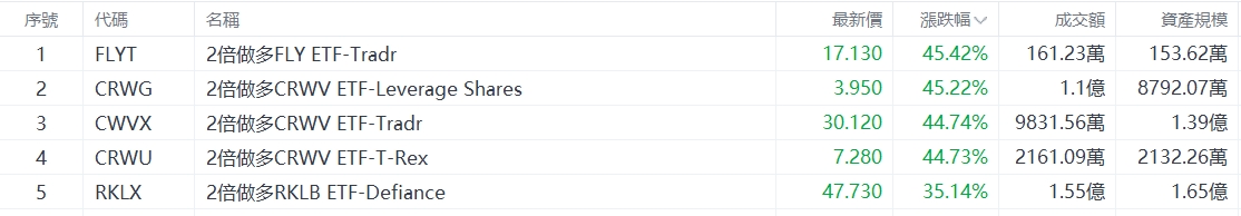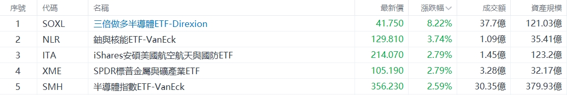 美股ETF升幅榜Top5