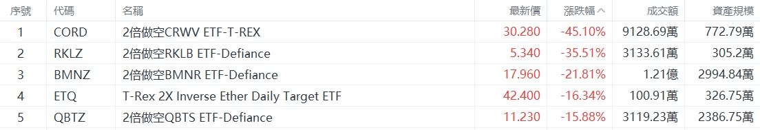 $2倍做空CRWV ETF-T-REX(CORD.US)$ 跌 45.10%,成交额 9128.69 万美元。