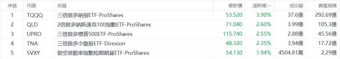美股大型指数ETF升幅榜Top5