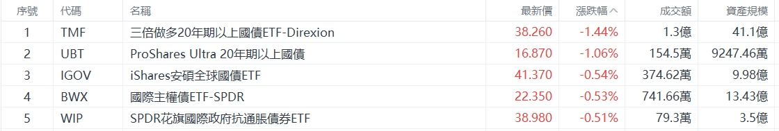 美股ETF跌幅榜Top5