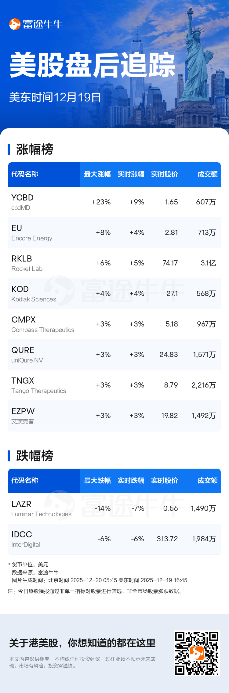 美东时间12月19日报道,以下为今日美股盘后热门个股。