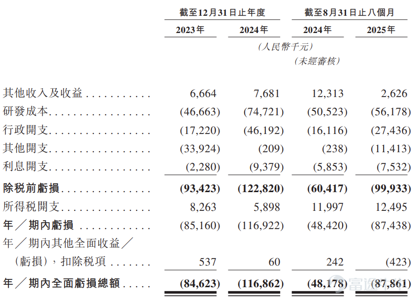 财务状况方面,翰思艾泰未产生收入,公司为扩展业务运营,绝大部分资金用于研发成本、其他开支、行政开支及利息开支。在过去的2023年、2024年和2025年前8个月,相应期间的研发开支分别为人民币4666.3万元、7472.1万元、5617.8万元,分别占相应期间总营业费用的73.0%、61.8%、67.2%。