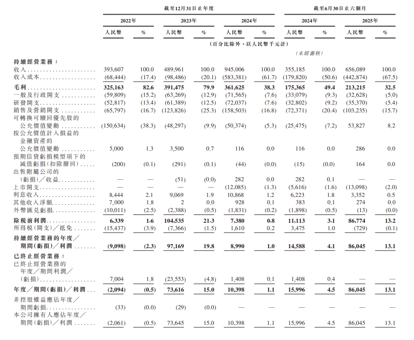 财务状况方面,公司于 2022 年、2023 年、2024 年以及截至 2024 年及 2025 年 6 月 30 日止六个月的收入分别为人民币 3.936 亿元、人民币 4.90 亿元、人民币 9.45 亿元、人民币 3.552 亿元及人民币 6.561 亿元。公司于 2023 年及 2024 年以及截至 2024 年及 2025 年 6 月 30 日止六个月录得来自持续经营业务的期内利润分别为人民币 0.972 亿元、人民币 0.09 亿元、人民币 0.146 亿元及人民币 0.86 亿元。于 2022 年、2023 年及 2024 年以及截至 2024 年及 2025 年 6 月 30 日止六个月,公司的经调整净利润分别为人民币 1.492 亿元、人民币 1.466 亿元、人民币 0.844 亿元、人民币 0.46 亿元及人民币 0.512 亿元。
