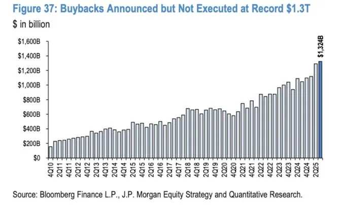 摩根大通研报指出,标普500公司长期以来一直通过股票回购和分红等方式,将超额资本持续回馈给投资者,表现优异。过去十年间,总股东回报从9050亿美元增长至约1.8万亿美元(年均复合增长率约7%)。今年以来,股票回购公告数量创下历史新高,日均回购规模达40-50亿美元,而2024年的日均回购规模约为40亿美元。由于近几个季度回购执行速度有所放缓,导致“尚未执行的回购”余额增至1.3万亿美元。