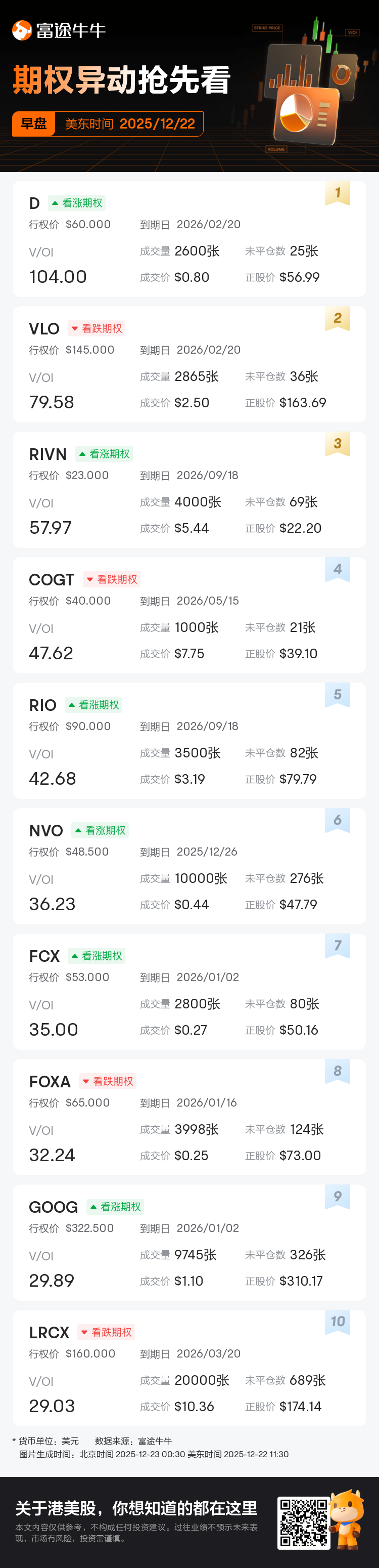 若在对应时段有超过3笔V/OI≥10的交易,将在美东时间11:30、13:30和16:30各生成一篇期权异动资讯。