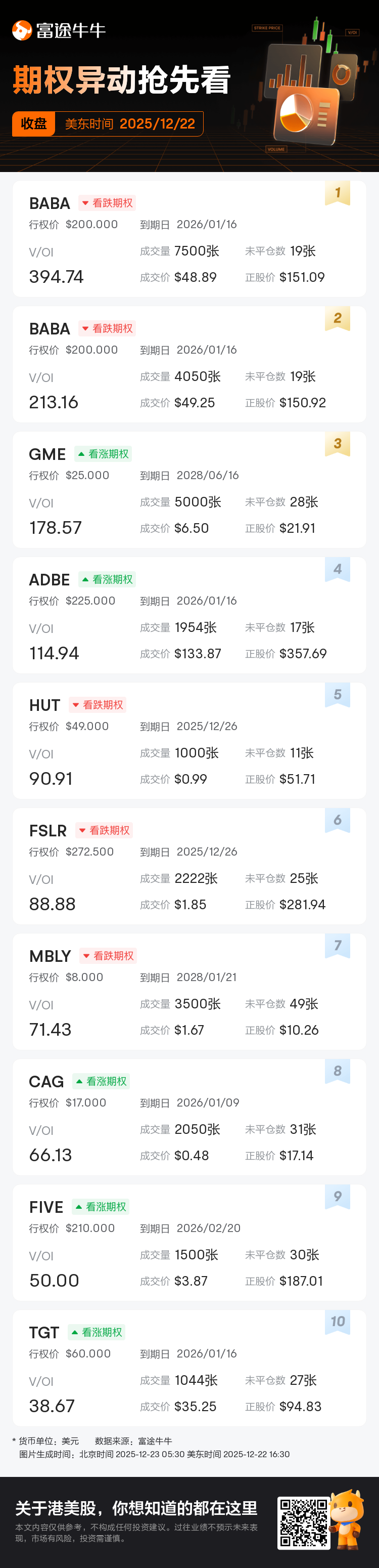 $阿里巴巴 (BABA.US)$的一笔看跌期权成交量达到了7,500张,远超过其未平仓数19张,V/OI值高达394.74,该交易涉资3,666.75万美元。该合约的行权价为200.000美元,到期日为25天后的2026年1月16日。