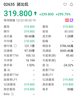 富途资讯12月23日消息,$诺比侃 (02635.HK)$首日高开,涨近300%,截至发稿,报319.8港元,每手50股,不计手续费,一手赚11990港元。