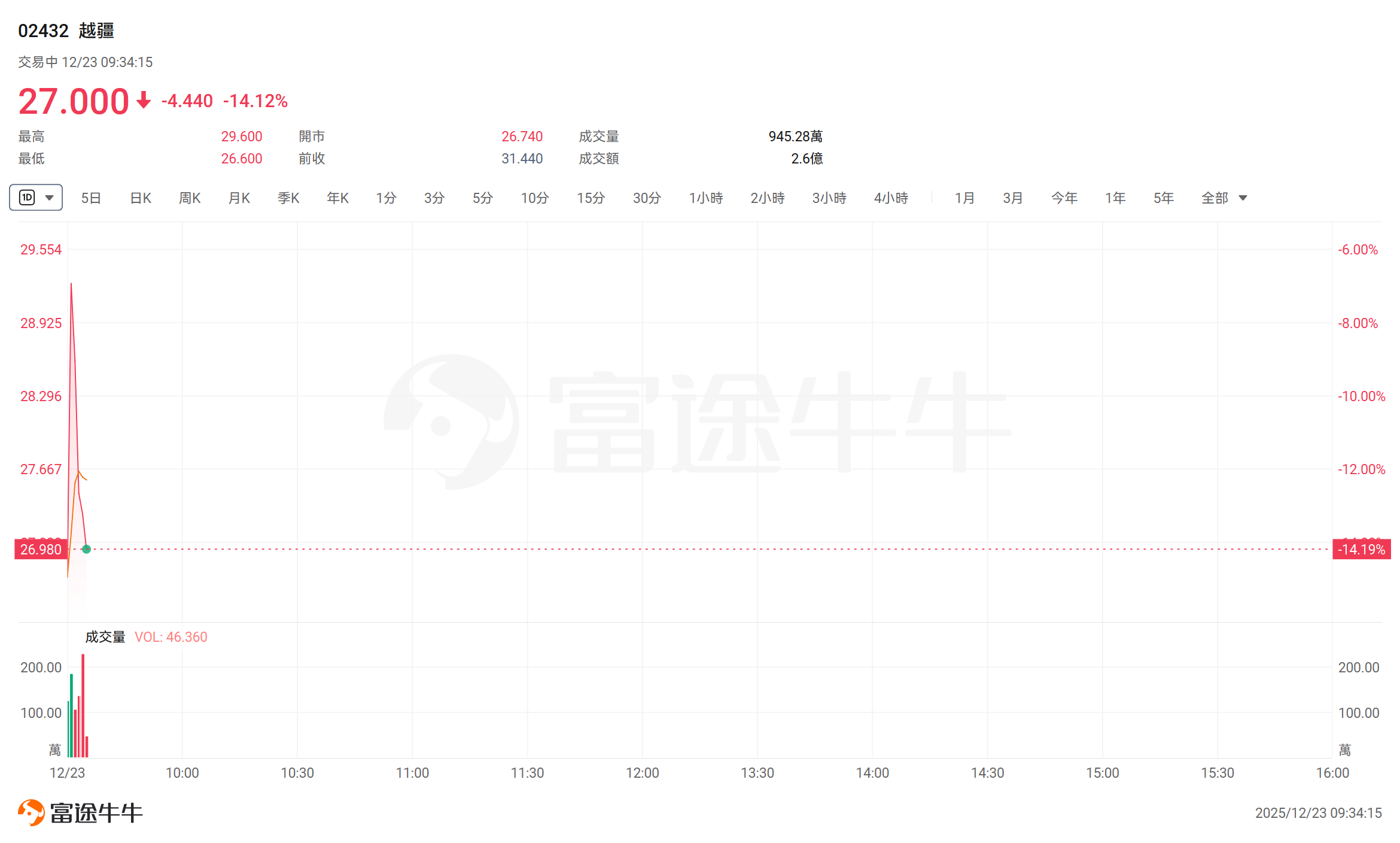 今日,机器人概念股 $越疆 (02432.HK)$ 跌超14%,截至发稿,跌14.12%,报27港元,成交额2.6亿港元。