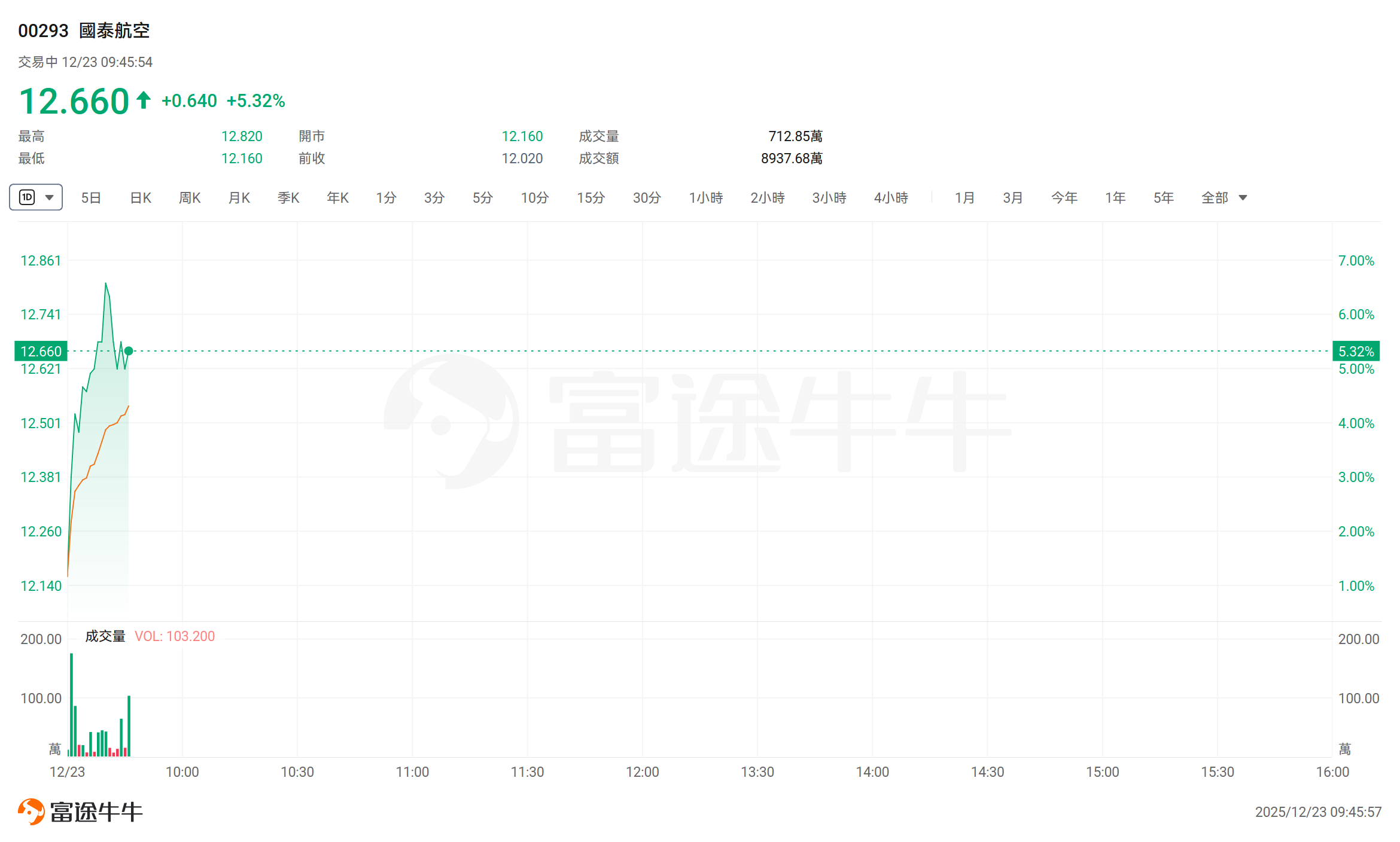 今日, $国泰航空 (00293.HK)$ 早盘涨超5%,截至发稿,涨5.32%,报12.66港元,成交额8937.68万港元。