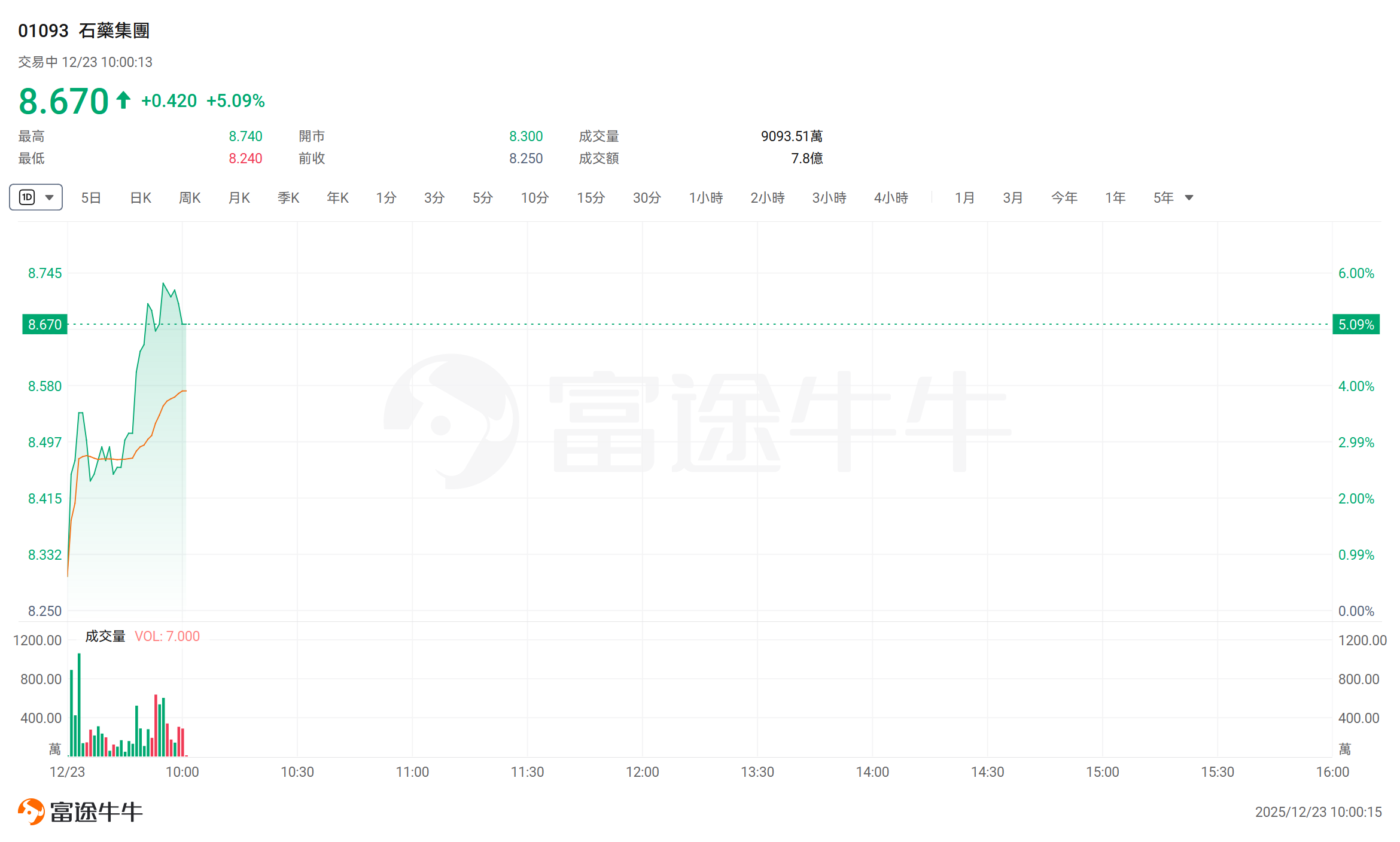 今日, $石药集团 (01093.HK)$ 涨超5%,截至发稿,涨5.09%,报8.67港元,成交额7.8亿港元。