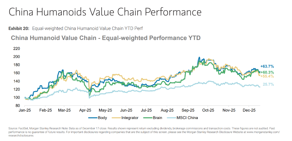 市场表现方面,摩根士丹利编制的Humanoid 100指数自2025年2月成立以来已上涨25%,跑赢标普500指数及MSCI欧洲、中国指数。随着全球机器人公司从实验室走向现实世界,赢家与落后者的分化将愈发明显,资本和人才将向展示出最强内部AI能力及制造专长的企业集中。