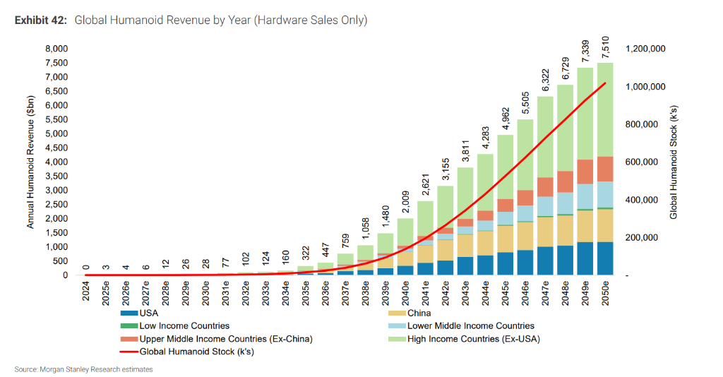 摩根士丹利维持了对该行业巨大的长期市场预期。根据该行的全球机器人模型预测,到2050年,全球人形机器人市场的年收入可能达到7.5万亿美元。假设更换周期为6年,且平均售价随供应链成熟而下降,预计到2036年全球将有约2440万台人形机器人被采用,而到2050年这一数字将达到10亿台。
