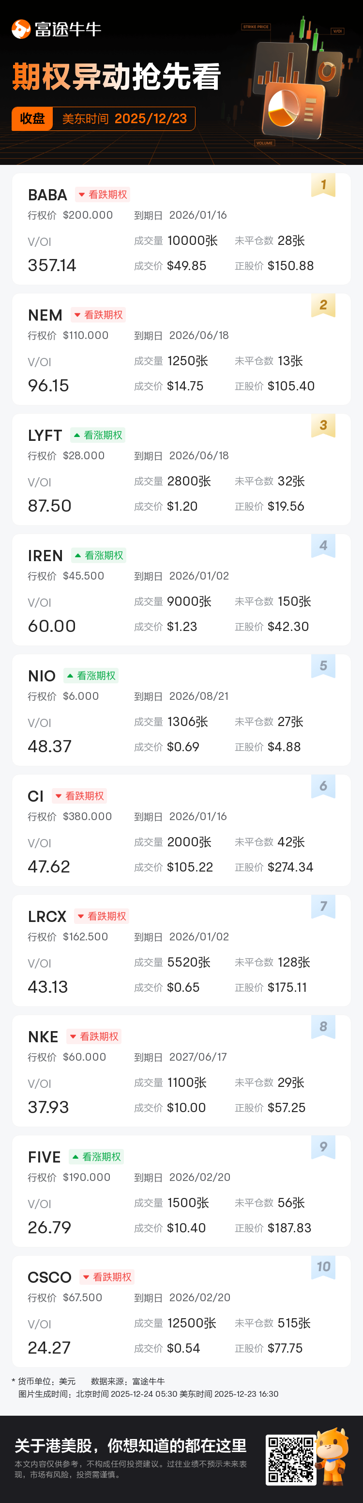若在对应时段有超过3笔V/OI≥10的交易,将在美东时间11:30、13:30和16:30各生成一篇期权异动资讯。