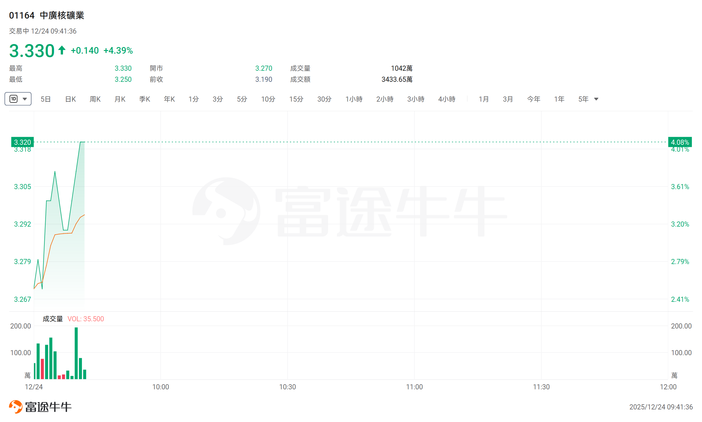 今日, $中广核矿业 (01164.HK)$ 再涨超4%,截至发稿,涨4.39%,报3.33港元,成交额3433.65万港元。