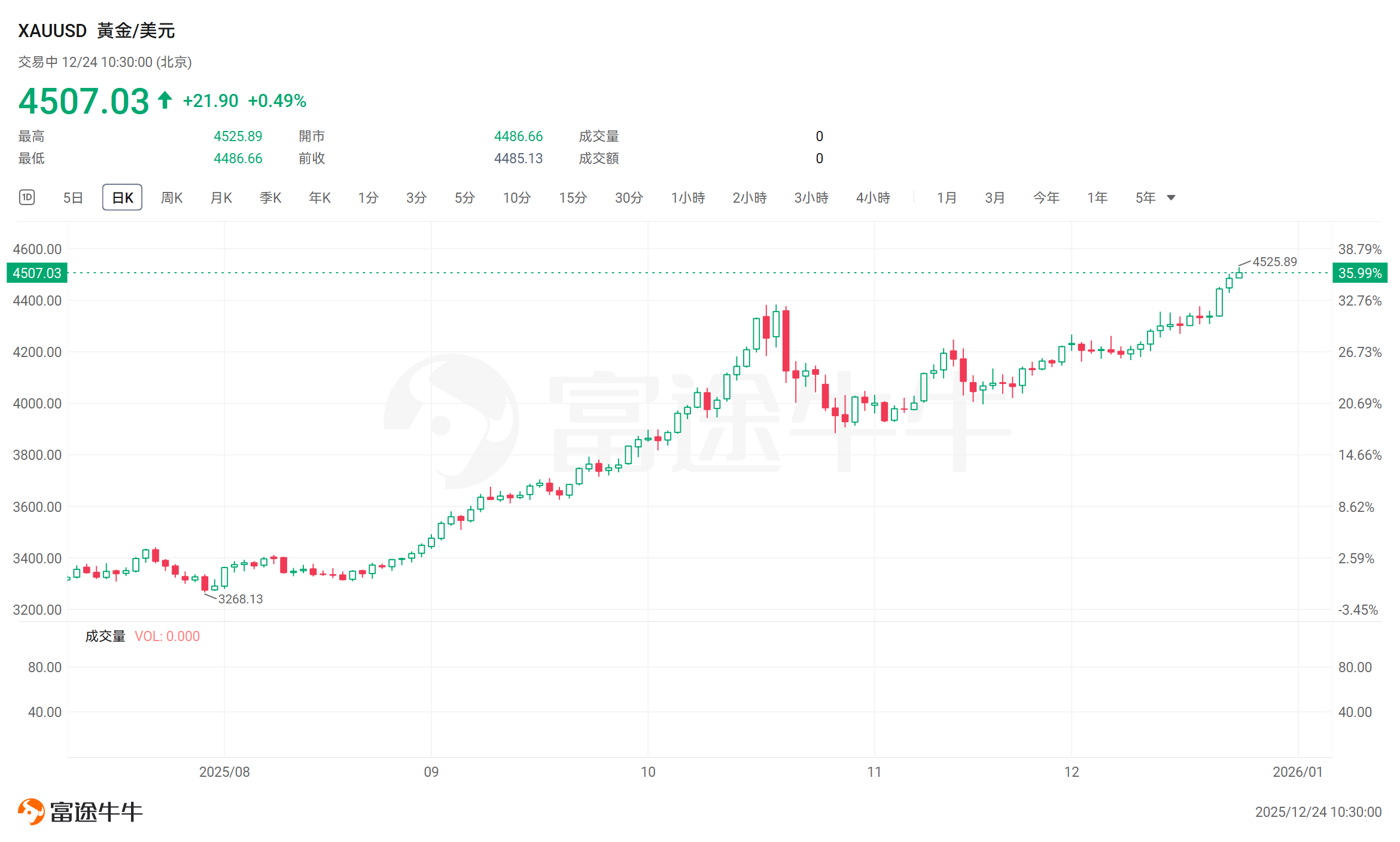 $黄金/美元 (XAUUSD.CFD)$ 价格有史以来首次突破每盎司4500美元,今年以来已累计上涨超过三分之二,有望创下自1979年以来的最佳年度表现。