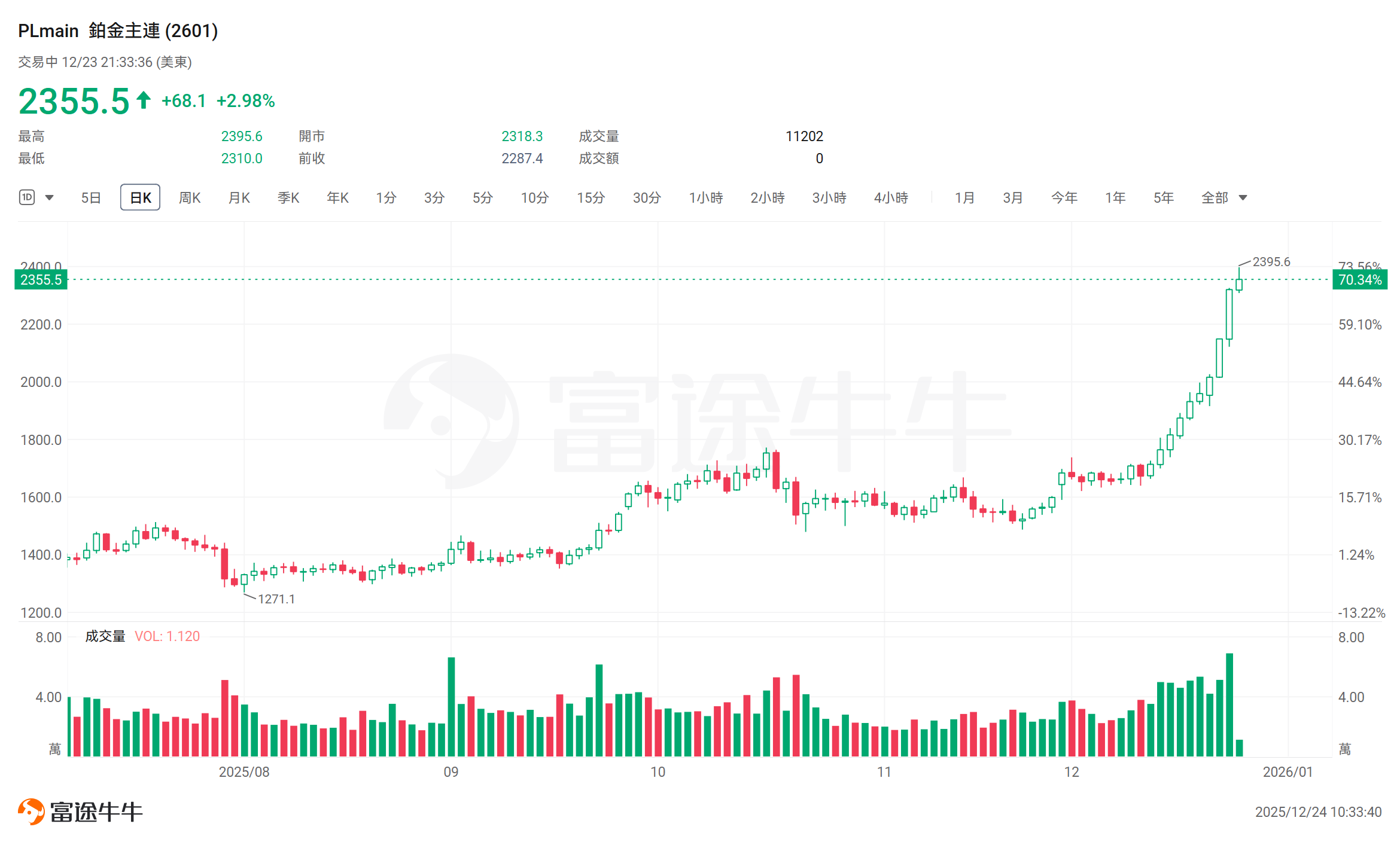 $铂金主连 (2601) (PLmain.US)$ 价格也飙升至每盎司2300美元上方的历史最高点。这一金属价格已连续10个交易日上涨,创下2017年以来最长连涨纪录,今年以来的累计涨幅更是超过150%,有望创下彭博自1987年有数据记录以来的最佳年度表现。