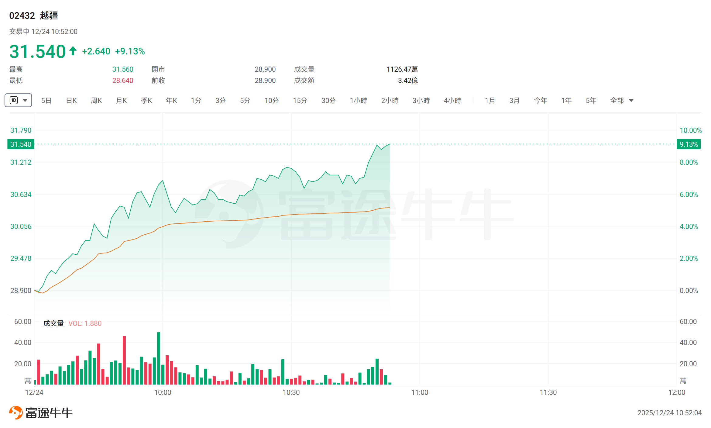 今日, $越疆 (02432.HK)$ 反弹超9%,昨日股价一度大跌16%。截至发稿,涨9.13%,报31.54港元,成交额3.42亿港元。