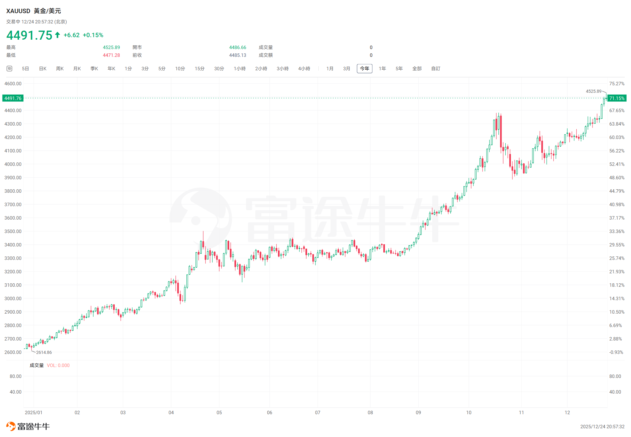 今日,现货黄金首次站上4525美元/盎司再创历史新高,今年累计上涨超71%。